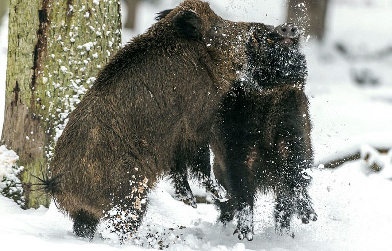 野生动物摄影师英戈o格拉赫(Ingo Gerlach)在德国黑森州哈瑙(Hanau)附近的森林里发现了中欧野猪的踪迹,并用镜头记录下两头300磅(约136公斤)重的野猪在冰雪覆盖的宁静森林中打斗的画面。