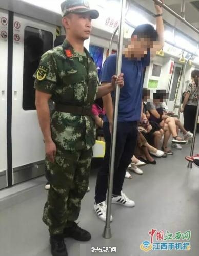 近日,江西南昌一消防坐地铁时,其手扶铁杆、目视前方、标准站立的英姿在人群中异常醒目。不少网友对此评论道:“穿军装就有会种责任感。”图文:中国江西网