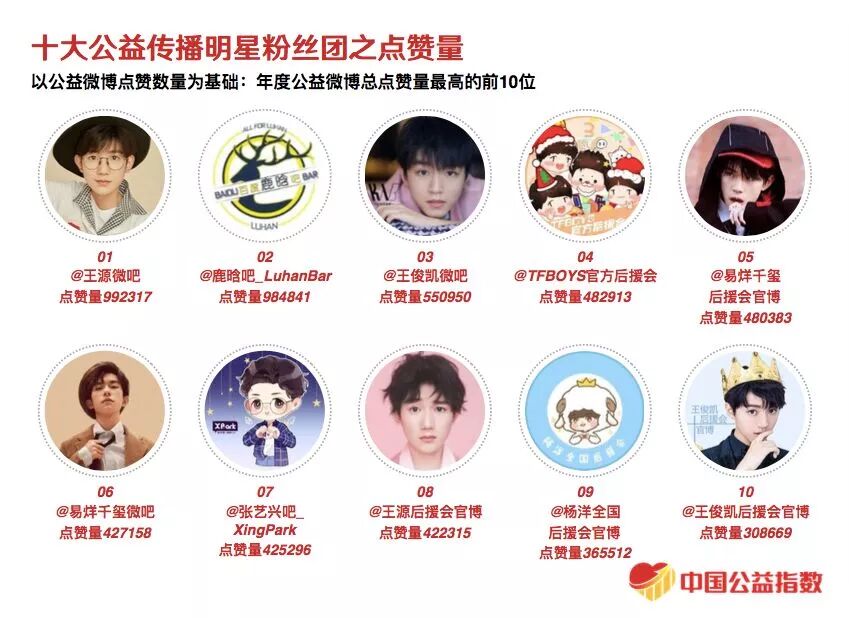 2017年中国公益指数榜按点赞量评选出的十大公益传播明星粉丝团