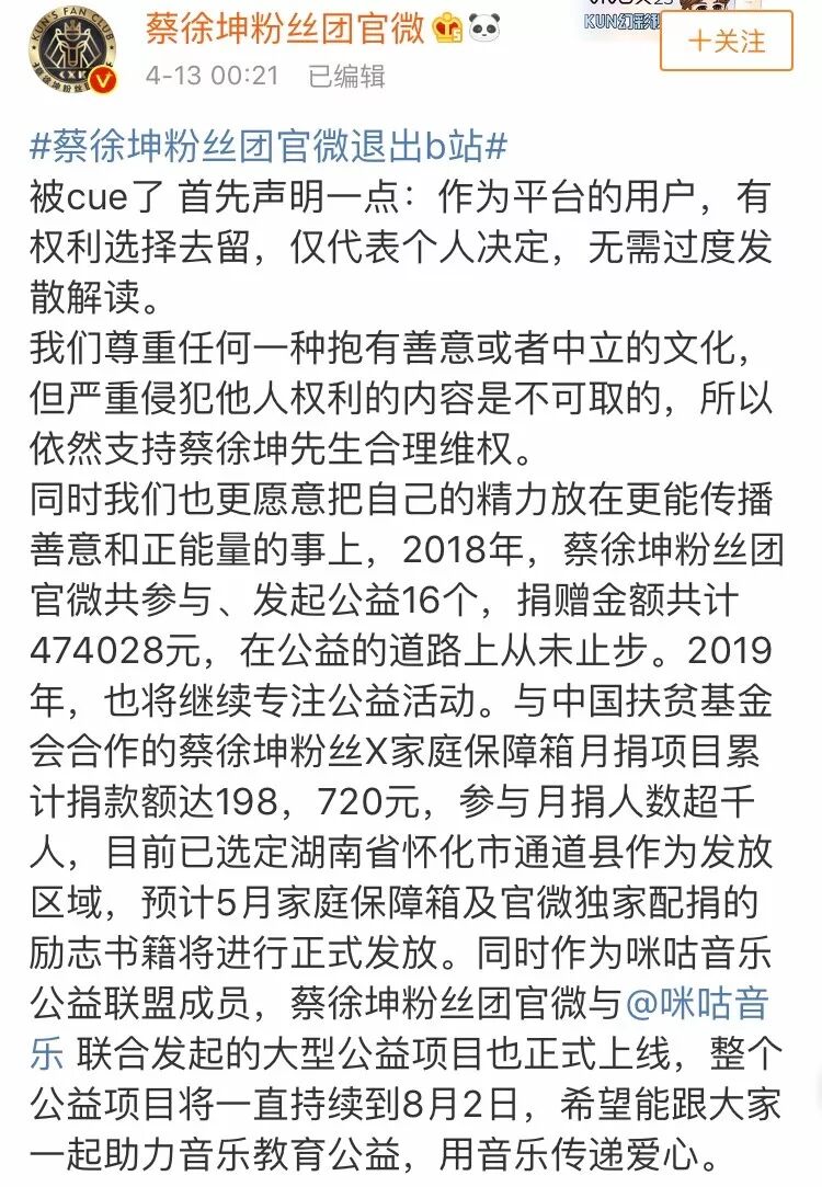 4月13日,粉丝团发博:“我们更愿意把自己的精力放在更能传播善意和正能量的事上,2018年,蔡徐坤粉丝团官微共参与、发起公益16个,捐赠金额共计474028元,在公益的道路上从未止步。2019年,也将继续专注公益活动。”