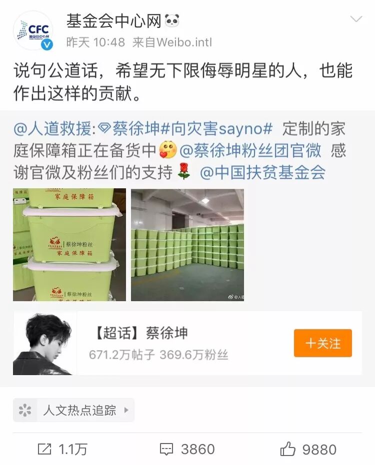 @基金会中心网在4月17日转发了这条微博并且配文:“说句公道话,希望无下限侮辱明星的人,也能作出这样的贡献。”似乎在声援蔡徐坤,抵制网络暴力,并且鼓励粉丝的公益行动。