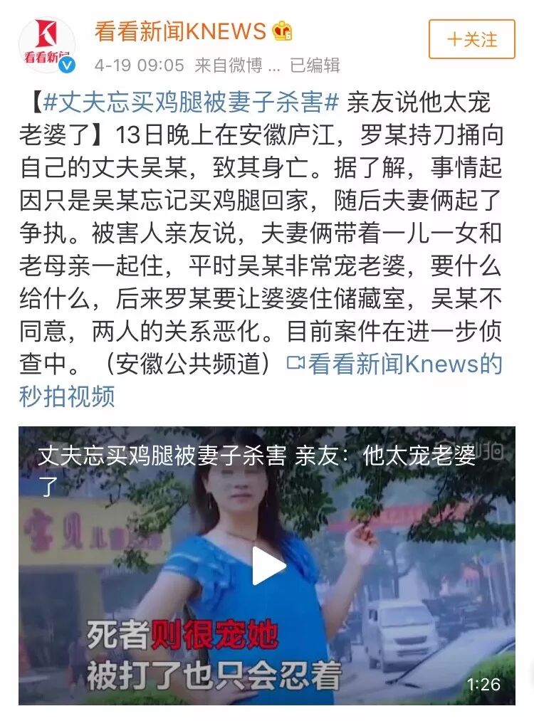 事情的起因是丈夫外出应酬,答应回家时给妻子带鸡腿,但因为饭局结束太晚,忘记了买鸡腿回家。于是,妻子大怒,与丈夫发生争吵,两人在楼道里扭打起来。争执中的丈夫无意中踢到了妻子,妻子返身回屋拿来水果刀,当场将丈夫刺死。整个过程中,女儿就站在窗边,亲眼目睹爸爸倒在了血泊之中。