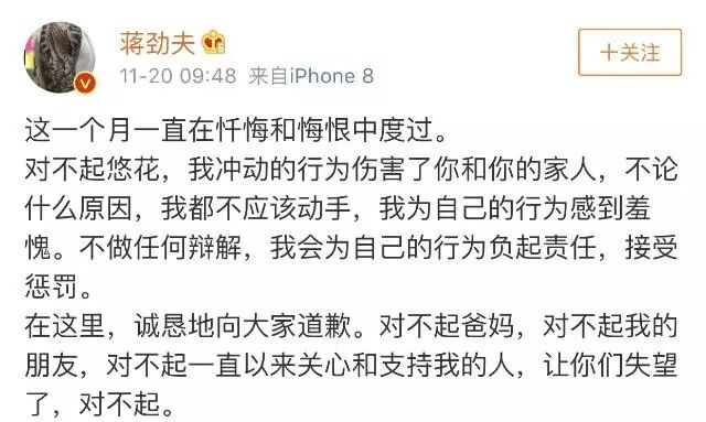 去年7月,蒋劲夫晒出自己和日本女友中浦悠花的照片,正式宣布恋情。然而出人意料的是,不到3个月蒋劲夫在ins中删掉了与女友的全部照片,被传分手。祸不单行,分手传闻刚出不久,就有人爆料,说蒋劲夫在日本惹了麻烦,到现在一直处于失踪状态。11月20日,中浦悠花更新ins,晒出多张身体及脸部淤青照片,直指蒋劲夫家暴。在群情激奋之时,蒋劲夫在微博承认家暴,并表示这一个月一直在忏悔和悔恨当中度过。
