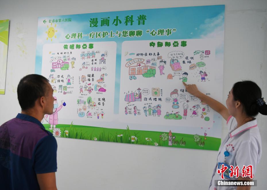 9月5日,在长春市第六医院,患者正在观看杨昆所制作的漫画。杨昆是长春市第六医院心理科一疗区的护士,她利用业余时间,将患者常见的疾病从症状、治疗措施、健康指导等方面,通过漫画的形式展现出来,帮患者家属了解常识,缓解忧虑心理。中新社记者 张瑶 摄